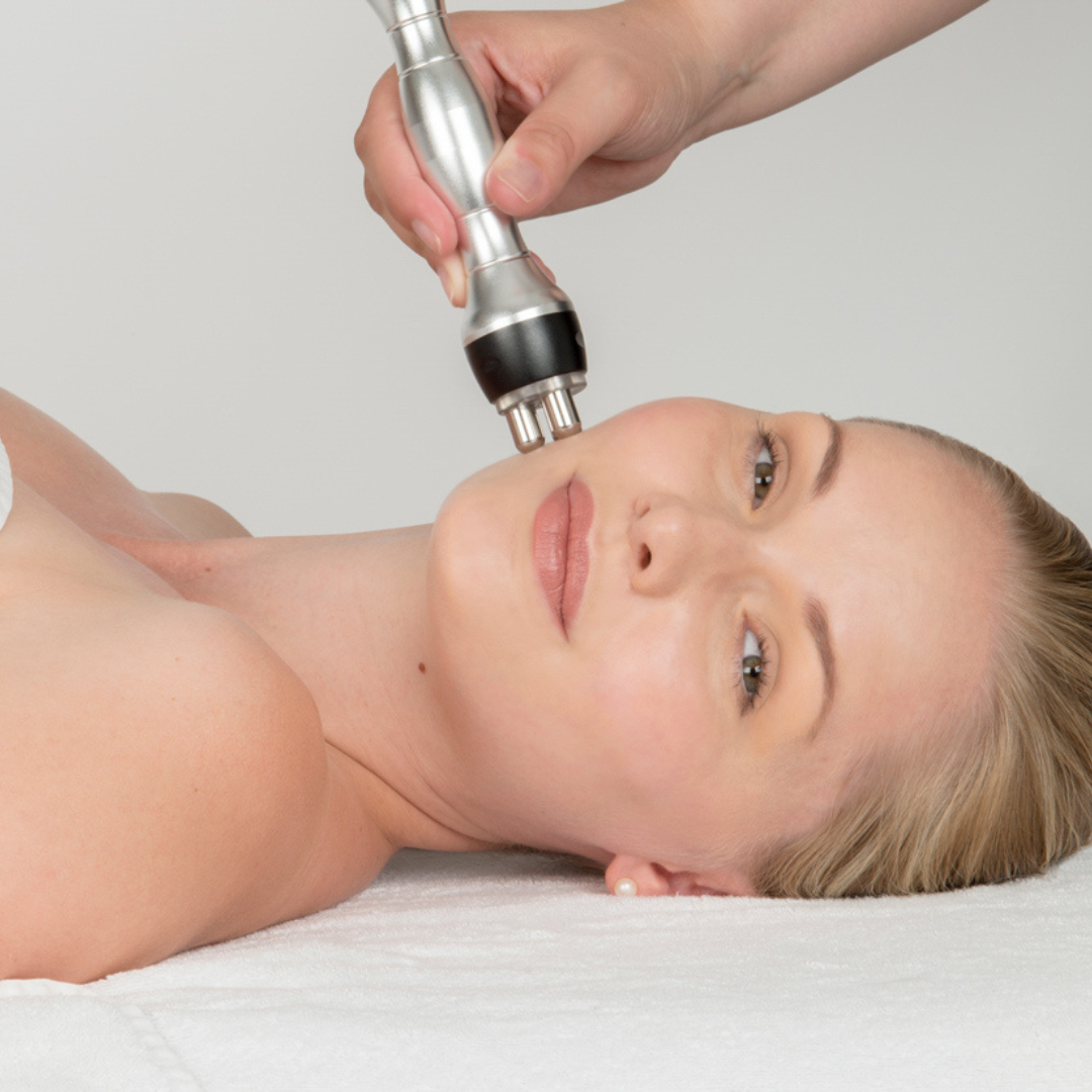 High frequency radio waves create a superficial temperature of 38 °C – 42 °C under the skin. This is capable of stimulating the existing dermal collagen and producing a contraction of the epidermis which in turn produces a tighter looking skin. When the RF current passes through the tissue/Dermis, it produces slight friction which results in an intense temperature change therefore there is a collagen and elastin stimulation due to an activation of fibroblast cells.